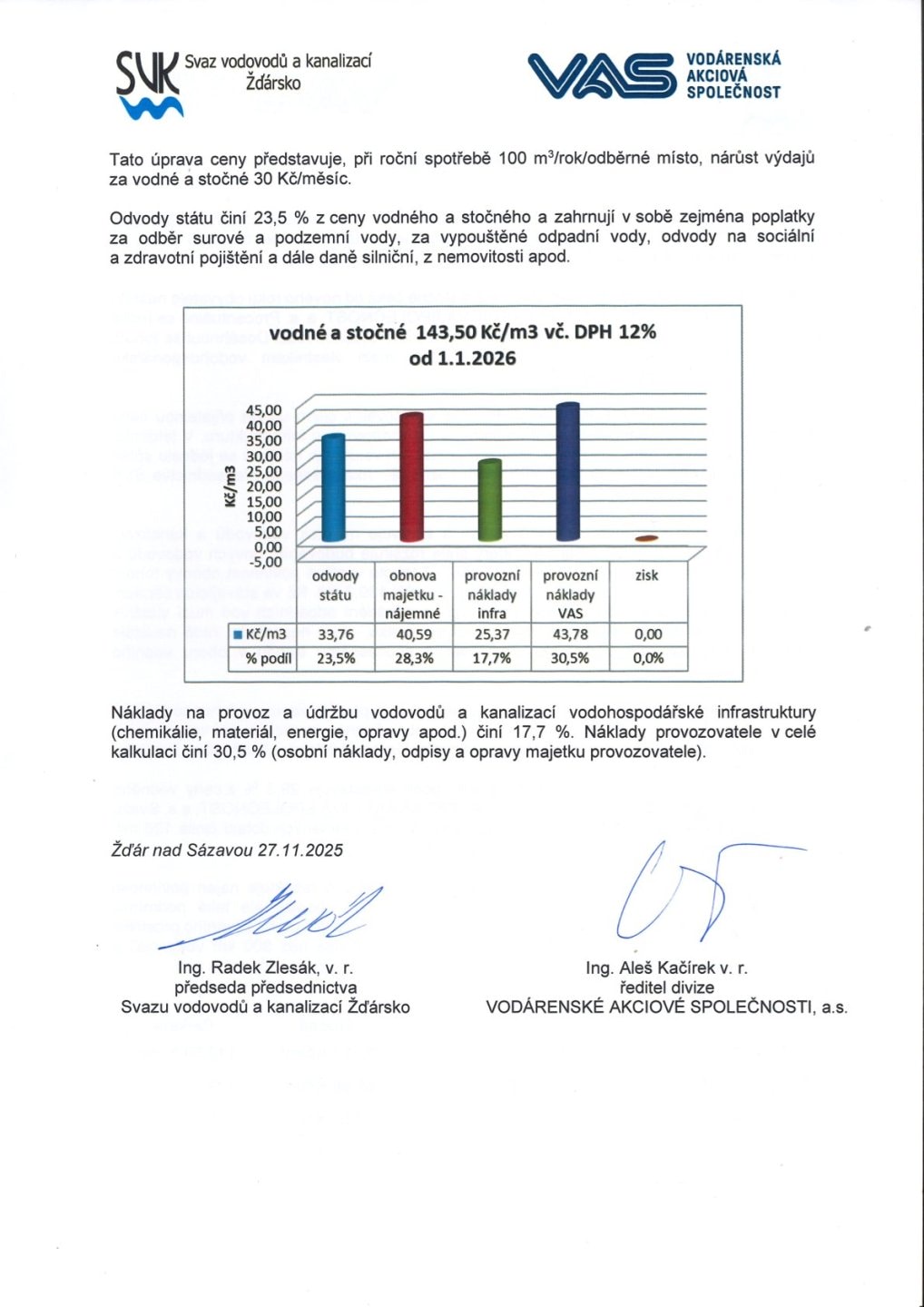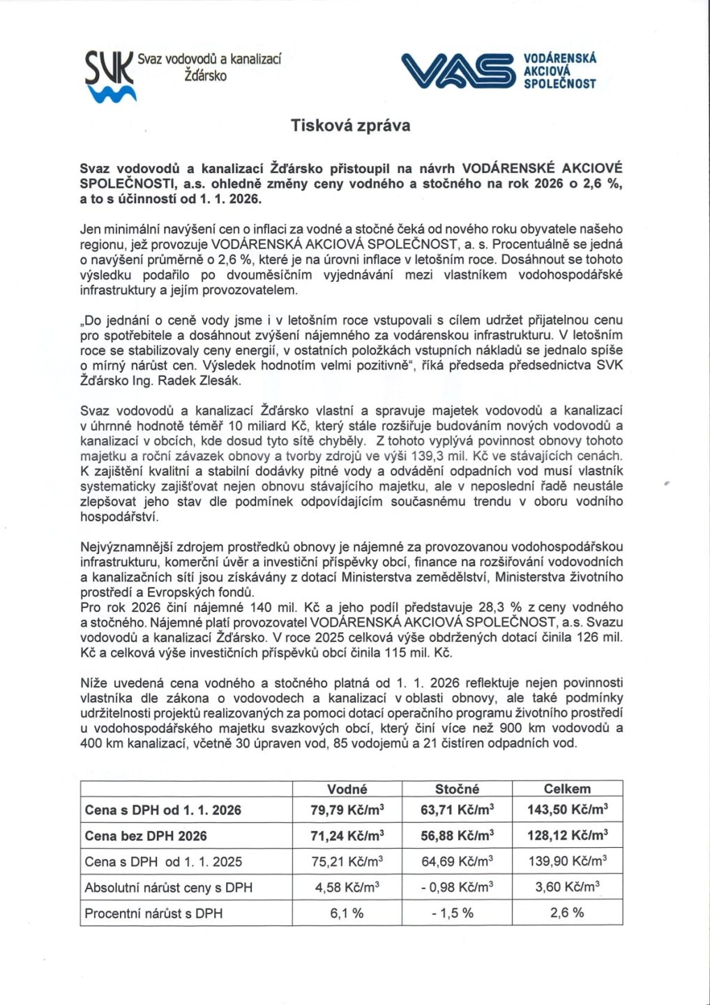 Cena pitné vody na rok 2026 se zvýší o 2,6 %. V Martinicích platí občané za 1 l pitné vody 0,079-Kč. Celková cena vody včetně vodného a stočného pro rok 2026 je 143,5-Kč/m3.