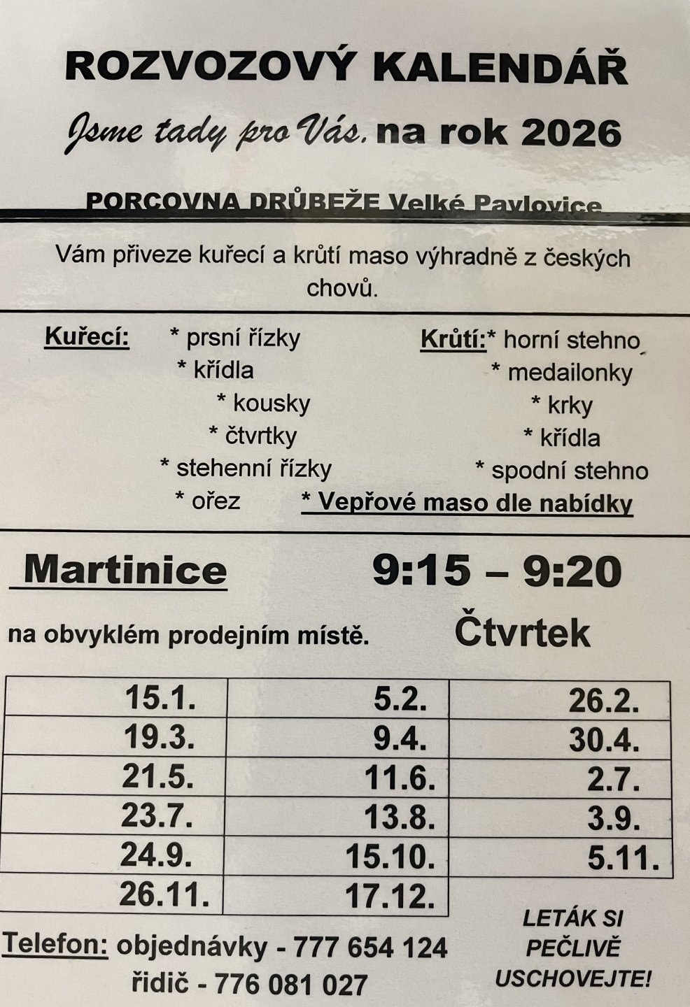 Také v letošním roce bude do Martinic zajíždět pojízdná prodejna masa z Velkých Pavlovic. Prodejna nabízí kuřecí, krůtí a vepřové maso za výhodné ceny. Poprvé v letošním roce přijede ve čtvrtek 15. ledna v době 9:15 - 9:20. Další termíny jsou 5. 2. a 26. 2. Prodejna bude stát u kulturního domu.
