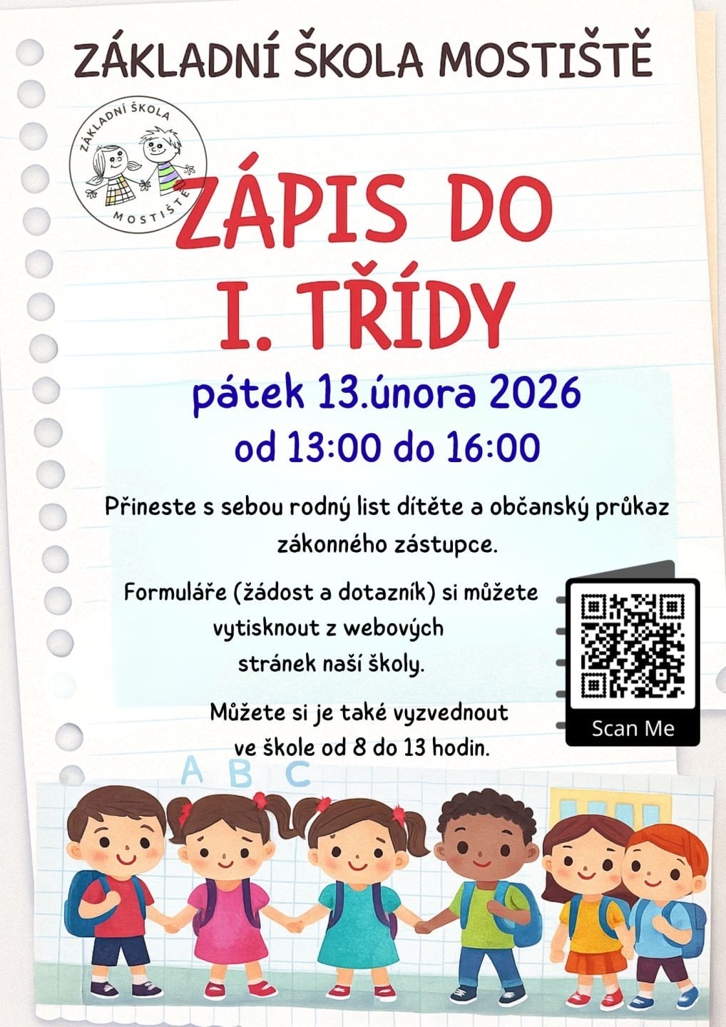 V pátek 13. února 2026 se bude konat zápis dětí do I. třídy základní školy. Všechny potřebné informace se dozvíte z přiloženého letáku a dalších dvou souborů.